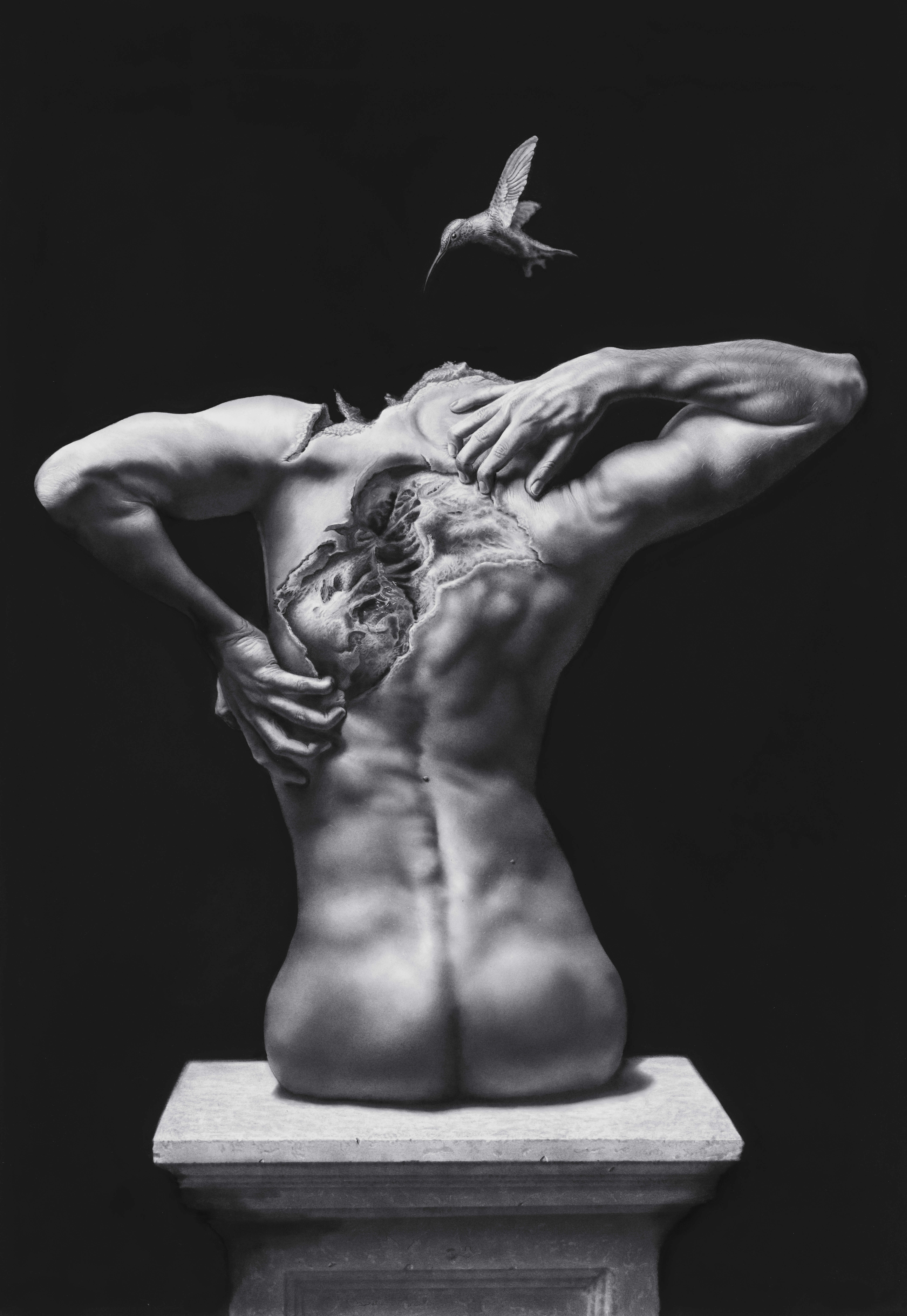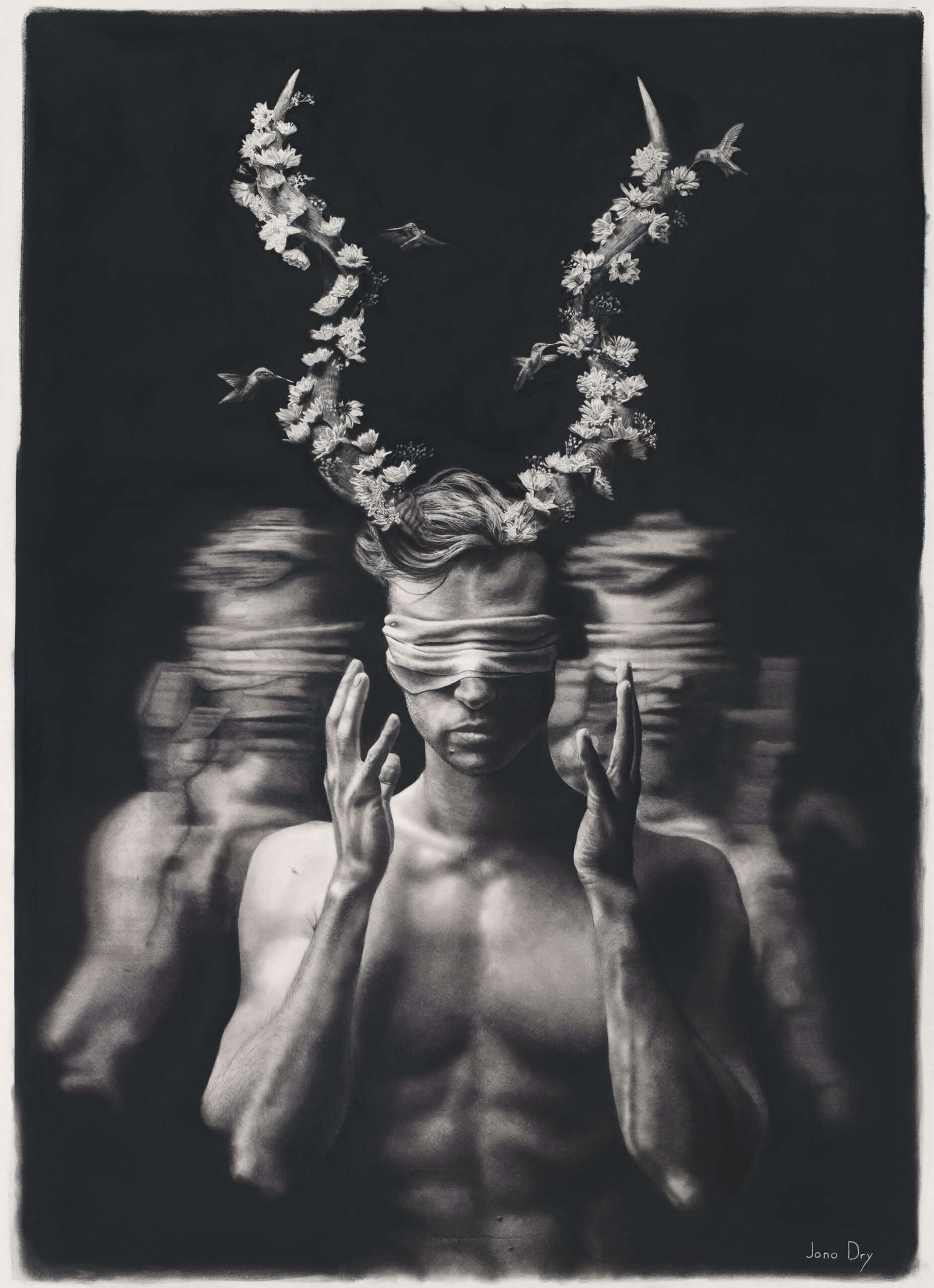Jono is a South African artist based in Cape Town whose graphite drawings exist somewhere between hyperrealism and the surreal. They’re sharply detailed, haunting, and emotionally resonant. His work often explores themes of isolation, inner conflict, healing, and memory, weaving in motifs like hummingbirds, bandages, and natural decay to articulate what can’t always be put into words.
