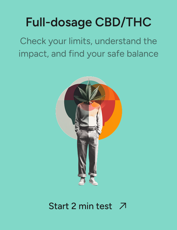 This free online personality test is for adults who believe that CBD/THC therapy can be helpful in their treatment of mental health issues and improvement of mental well-being, and want to know it for educational purposes. We don’t provide medical advice, offer instructions, or encourage the use of CBD/THC without medical supervision. Always consult with a qualified professional before making any decision to use it. CBD and THC can cause mental and physical health issues, be addictive and misused. If you feel unsafe, call professionals immediately.